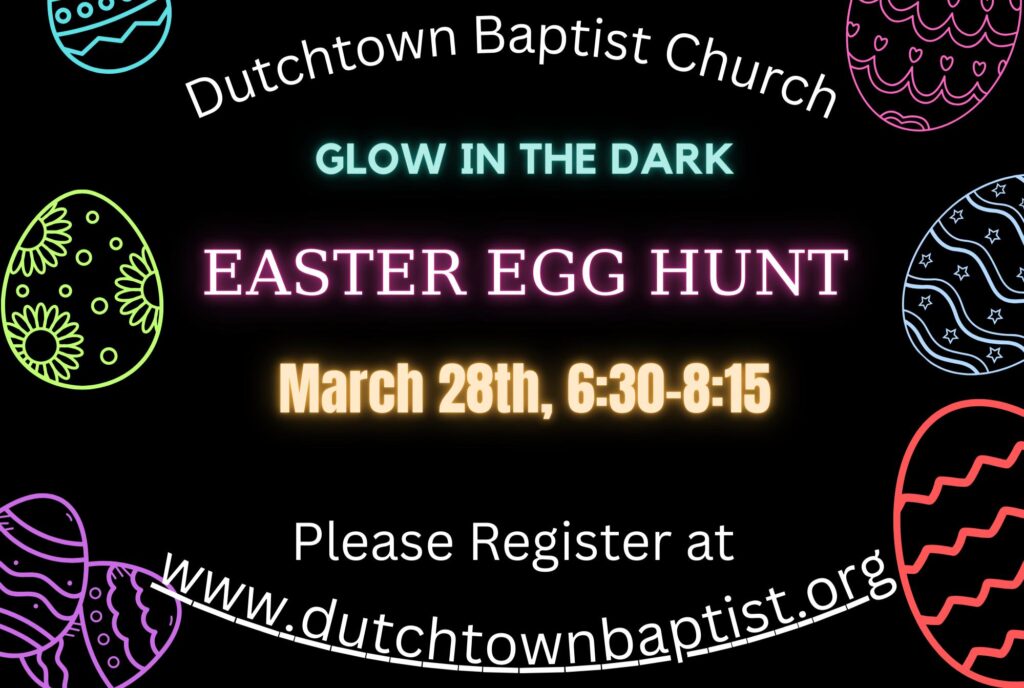 March 28 for our Glow in the Dark Easter Egg Hunt. Kids birth through 5th grade are invited for this night of egg hunt fun. Register online, on our app, or at the link below.