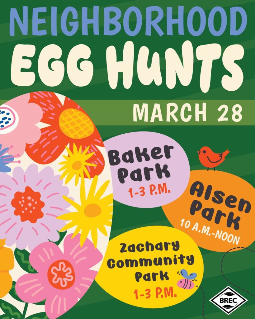 Details: Join BREC for springtime fun at their Neighborhood Easter Egg Hunts happening at multiple parks across the parish. Families can enjoy egg hunts, games, and plenty of Easter excitement. Pick your location and bring your baskets!