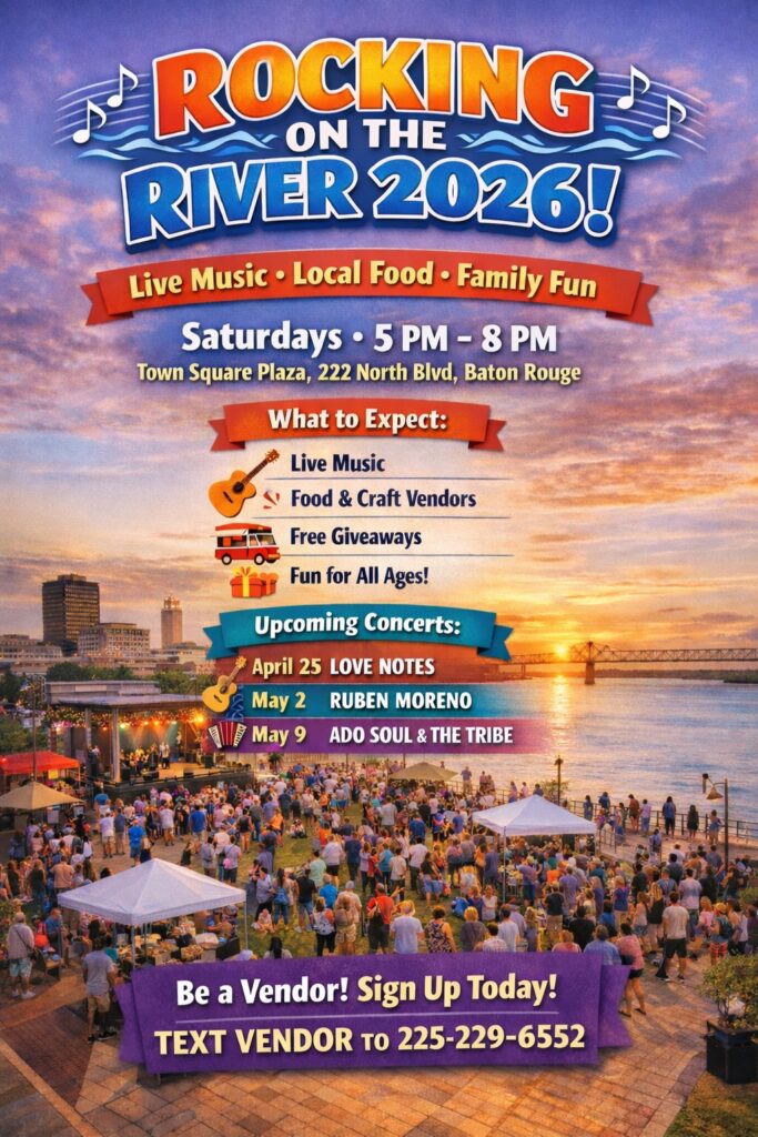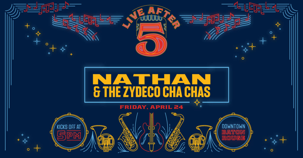 Details: Baton Rouge’s longest-running free concert series is back for another spring season! Enjoy live music, local food vendors, kids’ activities, and a fun, relaxed downtown atmosphere. This week features Nathan & The Zydeco Cha Chas, known for their high-energy blend of traditional Creole rhythms, blues, and R&B.