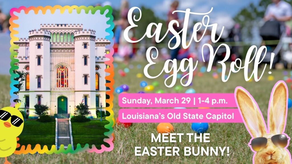 Details: Hop over to one of Baton Rouge’s most iconic landmarks for this family-friendly Easter tradition. Enjoy egg rolling on the lawn, visits with the Easter Bunny, and great photo opportunities at the historic castle while celebrating spring in downtown Baton Rouge.