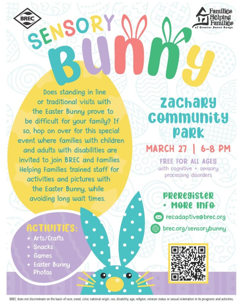 Details: BREC Adaptive invites families with children and adults with cognitive or sensory processing differences to Sensory Bunny, a special event featuring activities and photos with the Easter Bunny while avoiding long wait times.