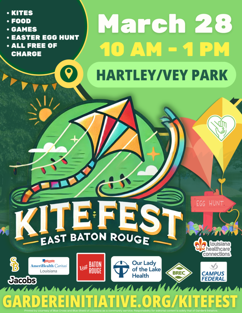 Details: Bring the kids and enjoy a morning of kite flying, music, food, and family fun at the 3rd Annual East Baton Rouge Kite Fest hosted by Gardere Initiative. Families can also enjoy an Easter egg hunt while celebrating a community event designed to bring neighbors together.
